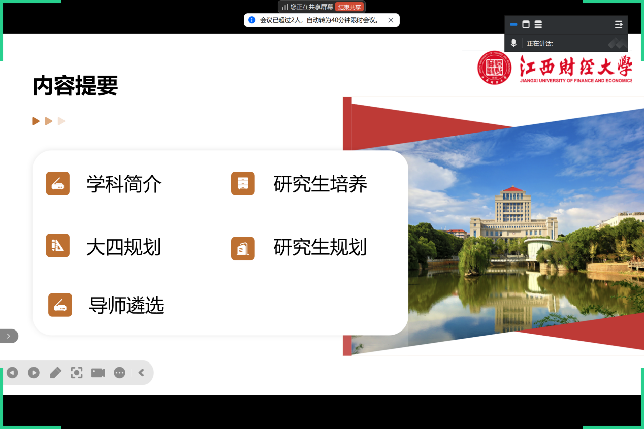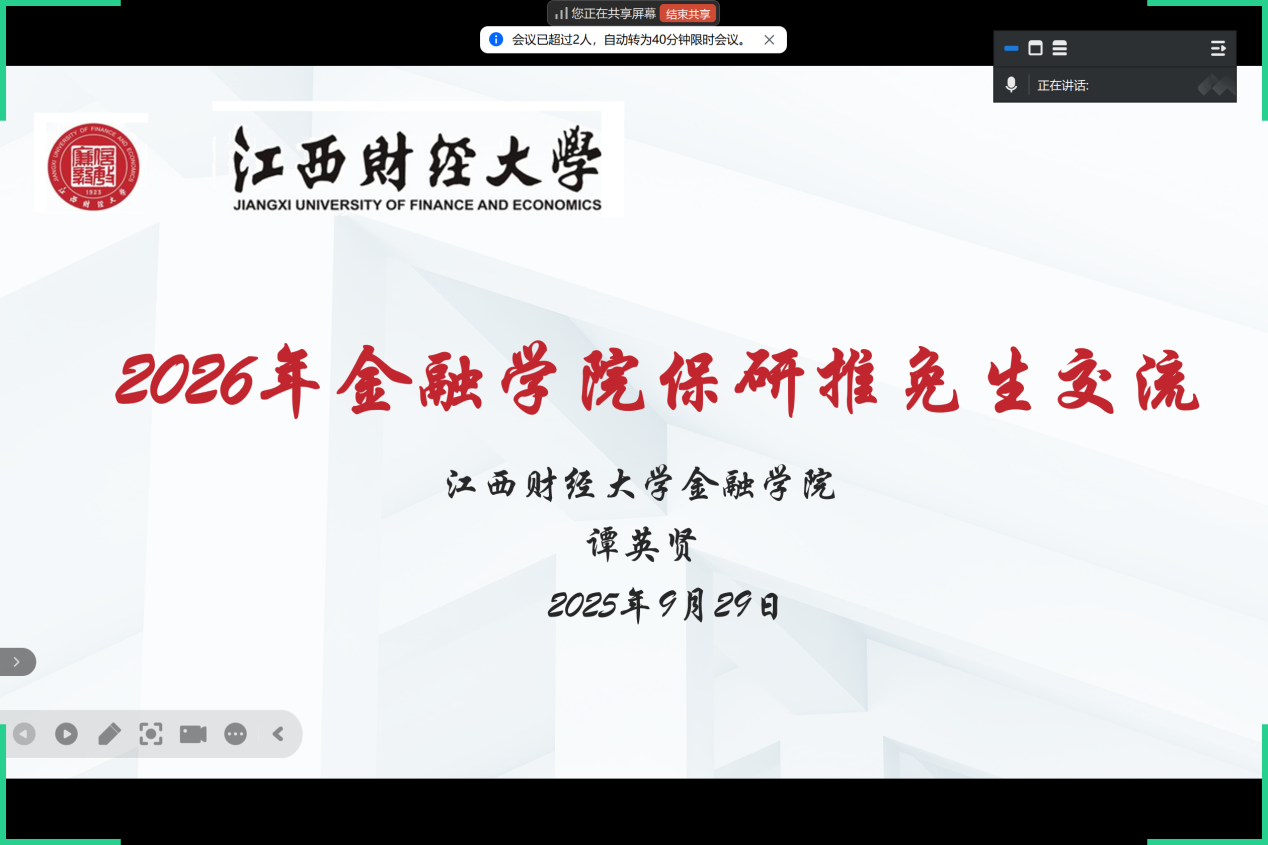 9月29日上午,抖音黑料通过依托腾讯会议平台,线上成功举办了“2026级保研推免生线上见面交流会”,会议由金融工程系主任谭英贤教授主持。会议围绕研究生阶段的学习科研规划、大四学年关键任务以及导师遴选流程等重要议题进行了深入讲解与交流,旨在帮助同学们2026级推免生提前明晰规划、做好准备、赢在起点。