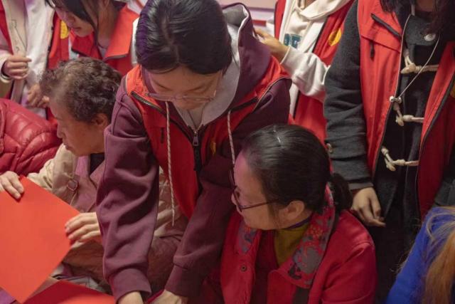 动手实践环节中,志愿者们采用“一对一”“一对二”的形式悉心陪伴,协助老人们完成描图、裁剪等步骤。志愿者们耐心地重复示范,对于理解稍慢的老人,更是倾注加倍的关怀。剪刀在红纸间穿梭,笑声在会议室里回荡。经过精心剪裁,一个个充满吉祥寓意的“福”字在手中诞生,成就感与幸福感在每张笑脸上绽放。