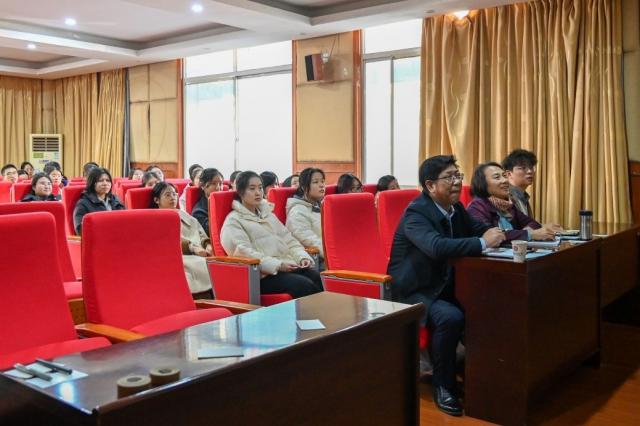 在翼轸楼二楼东报告厅,袁红林全程参与金融学 231 班“环启无限,融聚新程”主题班会,结合班会创意主题为学子送上成长寄语。他谈到,大学生活看似是日复一日的循环,实则暗藏成长的质变,鼓励大家不必畏惧单调,要在日常中深耕爱好、发现美好、追求卓越,努力将自身打造成兼具承载力与发展力的“成长平台”,实现自我突破。同时他叮嘱,人生本就喜忧相伴、得失并存,不必为一时境遇起落纠结;面对人生抉择时,要学会转换视角,以理性审慎的态度把握每一次机遇。