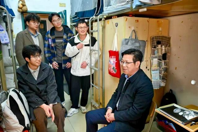 班会结束后,袁红林前往蛟桥园14栋617学生寝室,围绕能力培养、职业规划、实习经历、兴趣爱好等话题与同学们促膝长谈。他强调,当代金融学子要深耕学术沃土,既要筑牢数学基础,也要开拓编程等跨领域能力;要提前做好人生规划,主动积累实习实践经历,在培养个人爱好的同时学会劳逸结合,让大学生活充实而快乐。